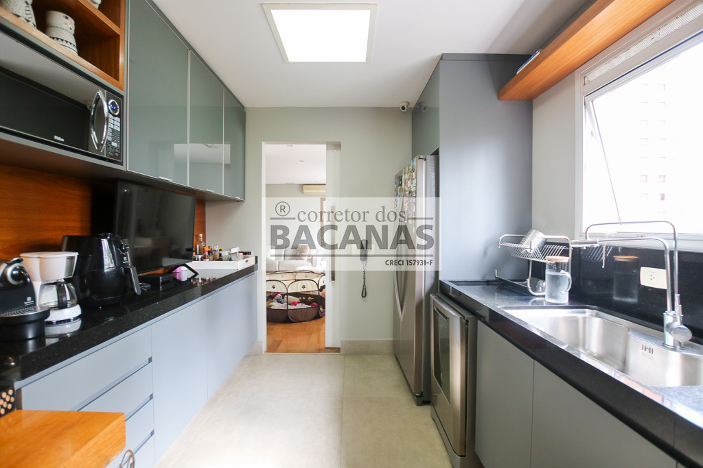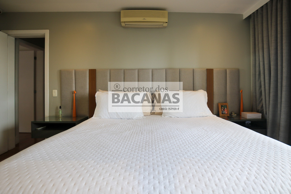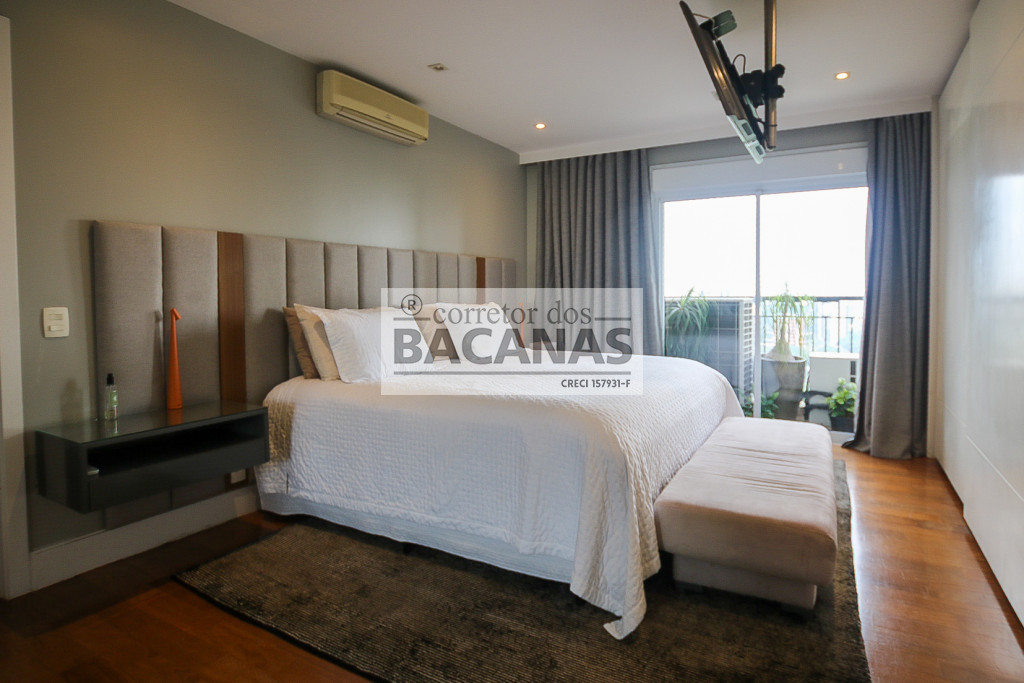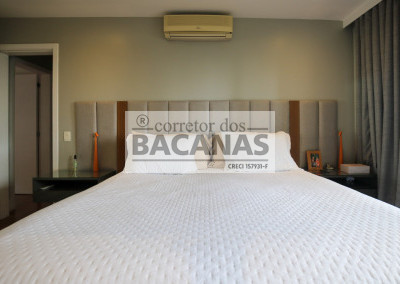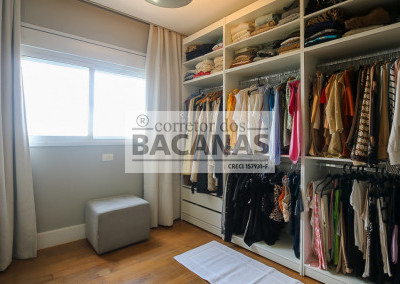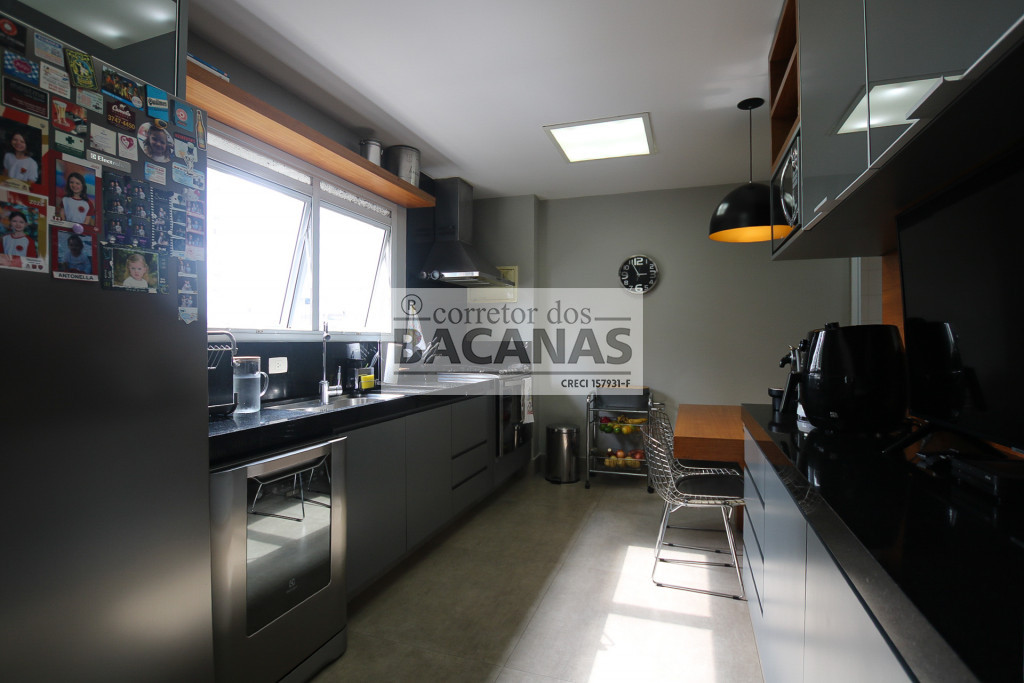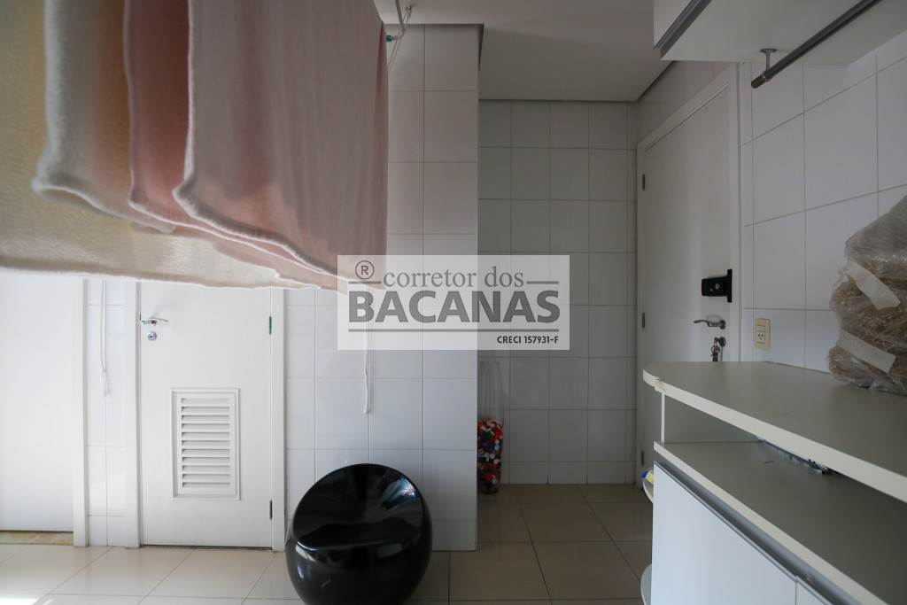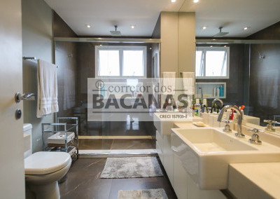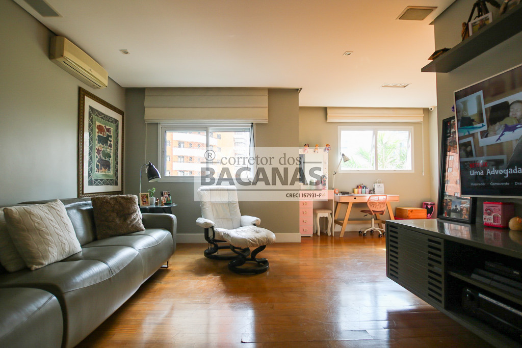 Originalmente com quatro suítes, a planta atual está configurada com três suítes amplas, sendo a quarta revertida em sala de TV (com fácil reversão). A área de serviço é completa, incluindo cozinha, sala de almoço, dormitório e banheiro de funcionário. Um diferencial importante é o gerador, que atende tanto as áreas comuns quanto a totalidade do apartamento.