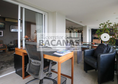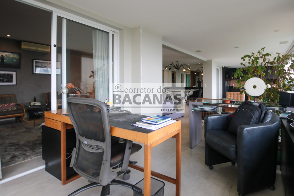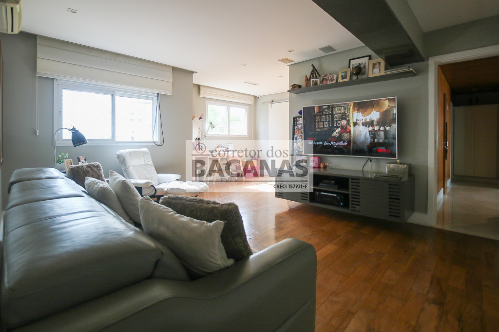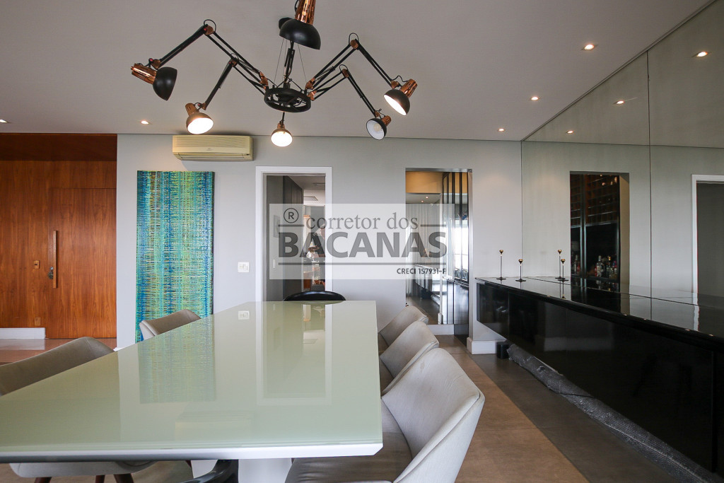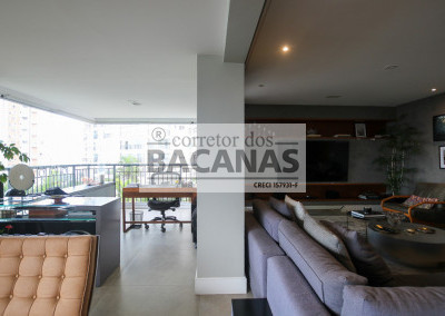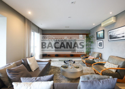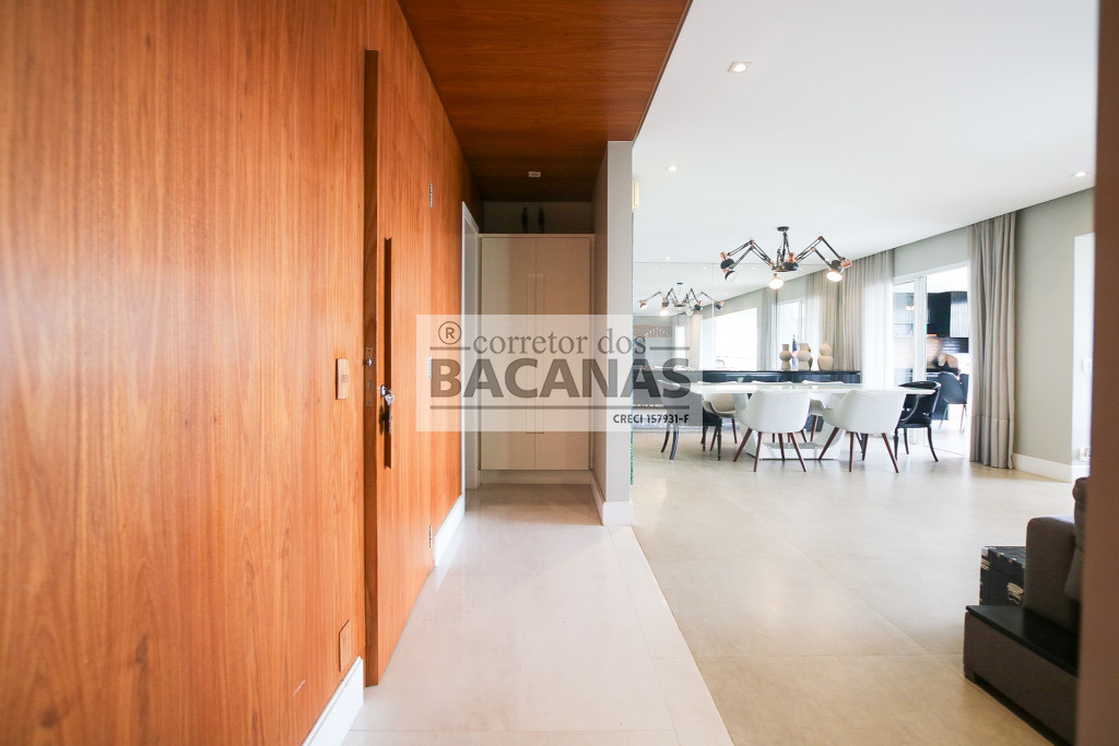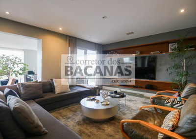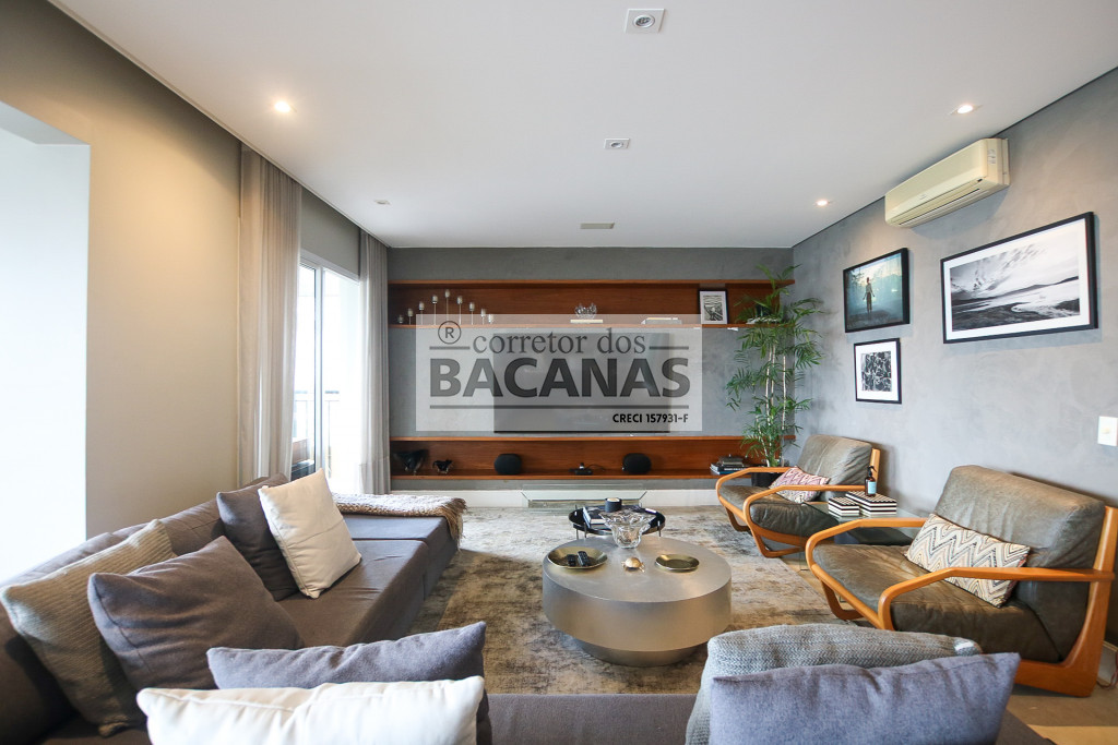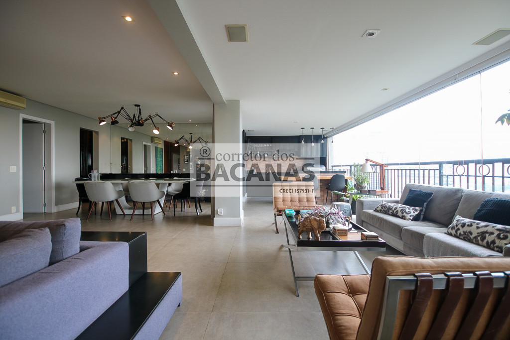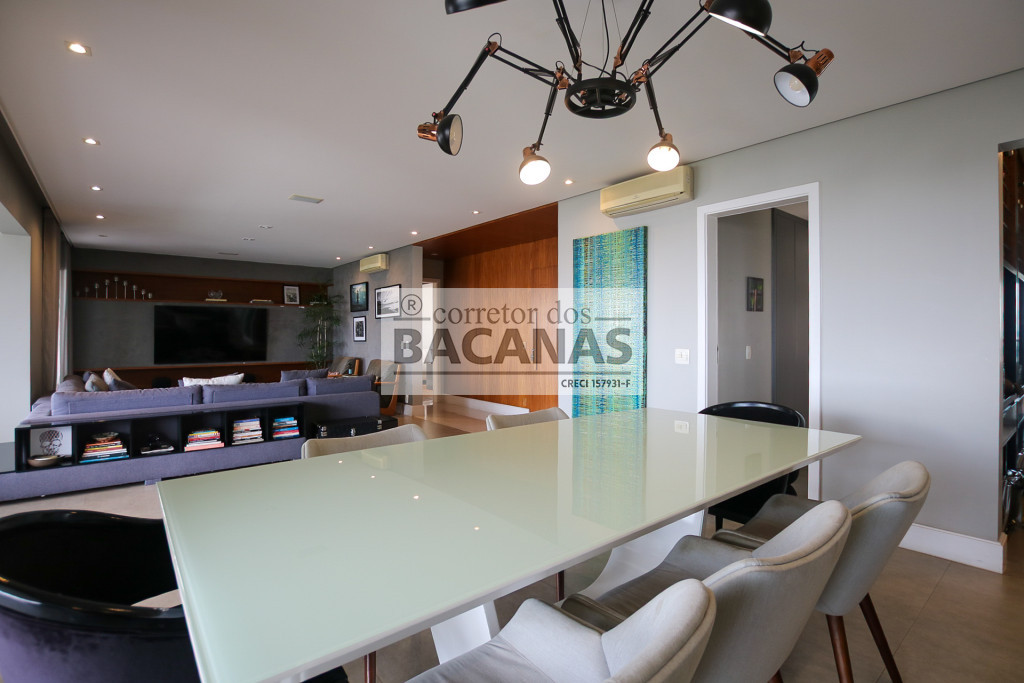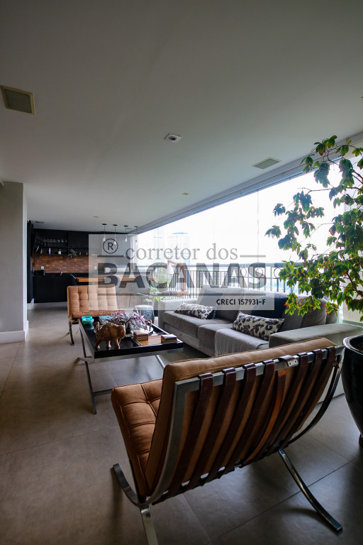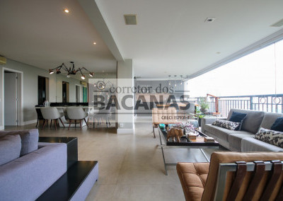 O imóvel conta com um amplo living para três ambientes, lavabo e hall social privativo com elevador biométrico. O terraço gourmet é totalmente envidraçado e equipado com churrasqueira, proporcionando uma extensão da área social com vista permanente.